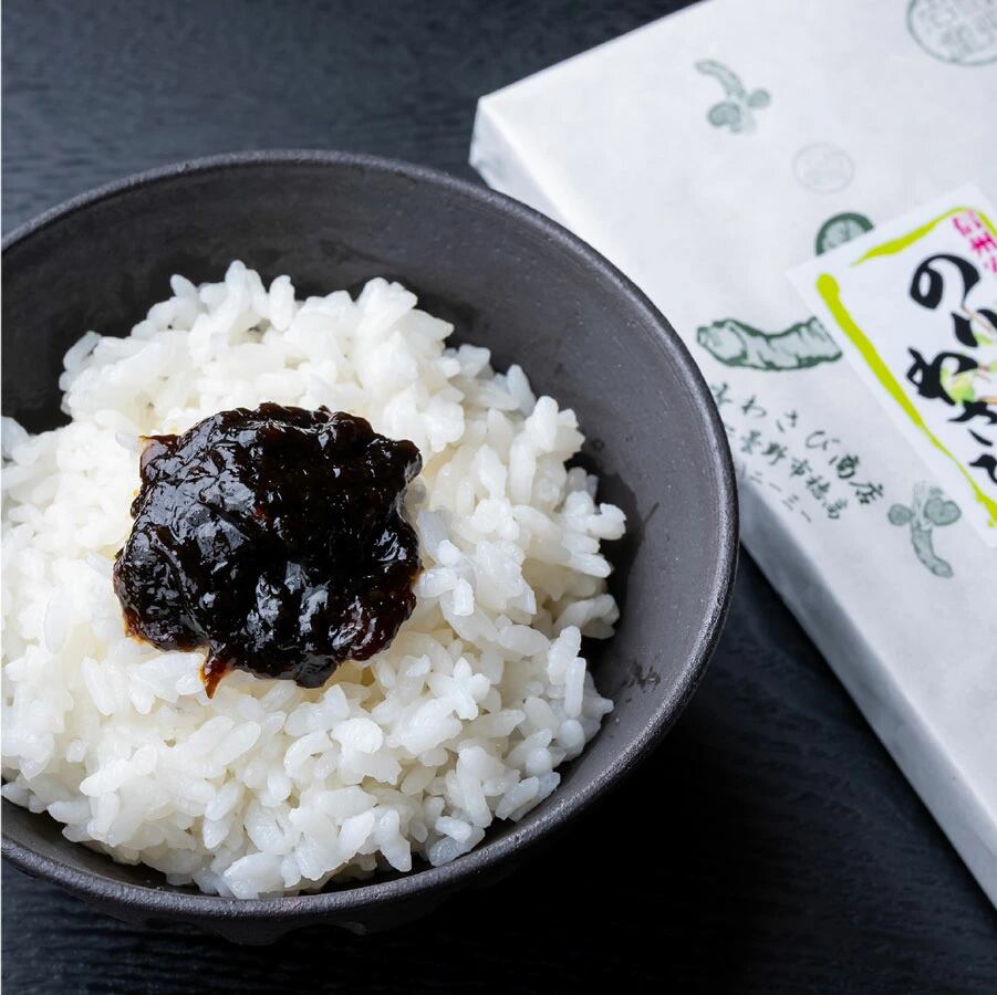 信州安曇野、わさび専門店さんのわさび漬けです!安曇野市穂高、清流で育った山葵に香川県産の岩海苔を使用しています。海苔の風味が山葵の辛味をより一層引き立てています。