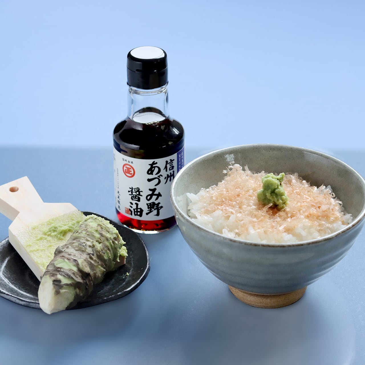 醤油は「丸正醸造」の淡口タイプ「信州あづみの醤油」をセット。やや甘めで、ご飯との相性が抜群です。